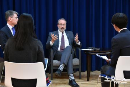 제임스 드하트 미국 국무부 방위비분담협상대표(정치군사국 선임보좌관)가 18일 오후 서울 용산구 미국대사관 공보원에서 내신 기자를 대상으로 기자회견을 하고 있다. (사진공동취재단)