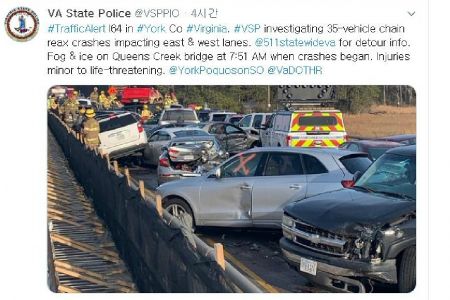 미국 버지니아주의 한 고속도로에서 22일(현지시간) 연쇄 추돌사고가 발생해 최소 40여명이 다치고 차량 60여대가 파손됐다고 뉴욕타임스(NYT)를 비롯한 미국 언론들이 전했다.