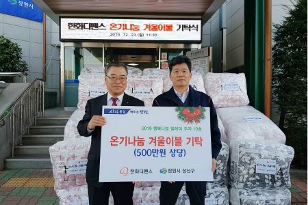 한화디펜스(대표이사 이성수)가 따뜻한 겨울나기를 위한 온기나눔 겨울이불 100채를 창원시 성산구에 기탁했다.
