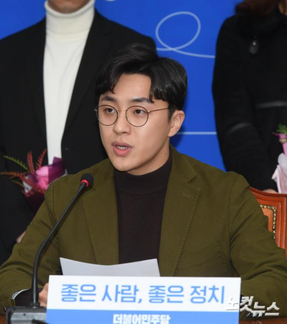 더불어민주당 '영입인재 2호'인 원종건 씨가 29일 서울 여의도 국회에서 열린 더불어민주당 인재영입 발표회에서 소감을 말하고 있다.