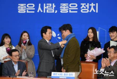 더불어민주당 '영입인재 2호'인 원종건 씨가 29일 서울 여의도 국회에서 열린 더불어민주당 인재영입 발표회에서 김병관 의원에 목도리를 선물 받고 있다.