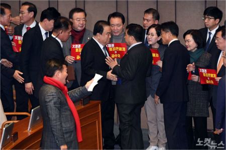 자유한국당 심재철 원내대표 등 한국당 의원들의 30일 오후 국회 본회의장에 들어선 문희상 국회의장을 막아서고 있다. (사진=황진환 기자/자료사진)