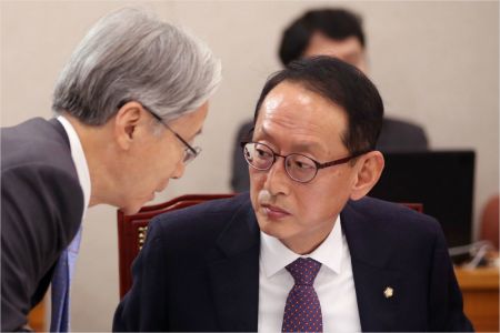 지난 30일 국회에서 열린 법제사법위원회 추미애 법무부 장관 후보자 인사청문회에서 여상규 법사위원장과 대화하는 김도읍 의원.(사진=연합뉴스)
