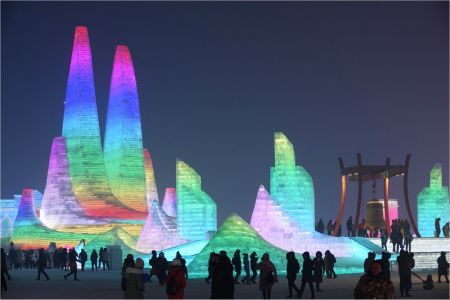 2만㎥에 가까운 얼음을 이용해 만든 40m 높이의 '쌍둥이 탑'을 비롯한 60만㎡ 넓이 행사장의 각종 얼음 건축물에는 LED 조명이 형형색색 빛났다.