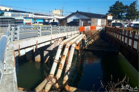 안인화력발전소 인근 횟집에 설치된 배수관로. (사진=유선희 기자)