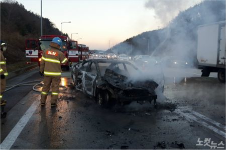 부산울산고속도로에서 차량 추돌사고로 화재가 발생해 차량이 전소하고 일대가 한때 정체를 빚었다.