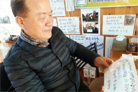 한 노인요양원에서 칠판에 '매월 5일은 선지 먹는 날'이라고 써놓은 메모를 보고 책임감도 느낀다고 이씨는 설명했다.