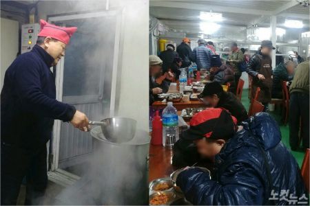이대길씨가 선지 해장국 100인분을 끓이는 모습(왼쪽)과 노숙인들이 식사를 하는 모습(오른쪽). (사진=이대길씨 제공)
