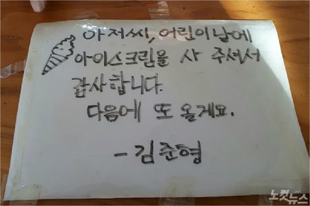 '아저씨, 어린이날에 아이스크림을 사 주셔서 감사합니다. 다음에 또 올게요. -김준형-'