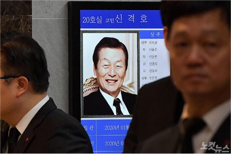 김상조 청와대 정책실장은 20일 오후 서울아산병원에 마련된 신 명예회장의 빈소를 찾아 조문한 뒤 취재진과 만나 "삼가 고인의 명복을 빈다"며 문 대통령의 말을 전했다.