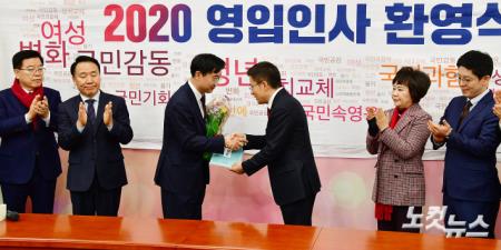자유한국당 황교안 대표가 21일 오전 국회에서 열린 2020 영입인사 환영식에서 영입인재 5호 신범철 전 아산정책연구원 안보통일센터장에게 꽃다발과 민평론 책자를 전달하고 있다.