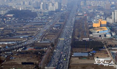 설 연휴를 하루 앞둔 23일 오후 경기도 용인시 신갈IC 인근 경부고속도로에 차량들이 지나고 있다. [항공촬영 협조 : 서울청 항공대 조종사: 경위 김홍규, 김두수- 승무원: 경위 김태훈, 순경 김지훈, 경기남부청 항공대 -조종사: 경감 김응종, 경위 김용-승무원: 경사 조동훈]