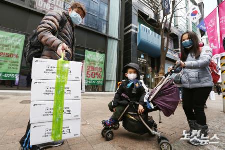 '우한 폐렴'이 세계적으로 확산하고 있는 가운데 28일 서울 중구 명동의 한 약국에서 외국인 관광객이 대량구매한 마스크를 취재진에 보여주고 있다.