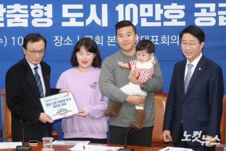더불어민주당 이해찬 대표가 29일 오전 국회에서 총선 3호 공약 '청년-신혼 맞춤형 도시 조성 등을 통한 주택 10만호 공급'을 신혼부부에게 전달하고 있다.
