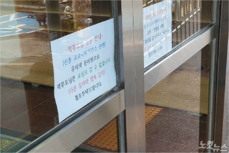 29일 광주의 한 유치원 건물 출입구에 우한폐렴 예방과 관련해 외부인과 학부모의 출입을 금지한다는 안내문이 게시돼 있다.(사진=광주CBS 조시영 기자)