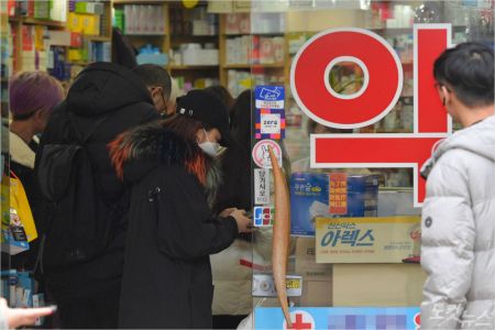 우한 폐렴 확진자 수가 늘어나고 있는 29일 서울 중구 명동 한 약국에서 관광객들이 마스크를 구입하고 있다. 박종민기자