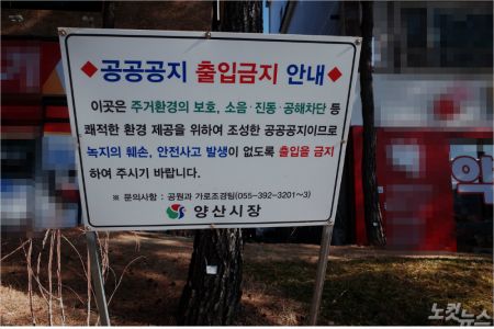 양산부산대병원 인근 양산시장 명의 공공공지 출입금지 안내 푯말. (사진=이형탁 기자)