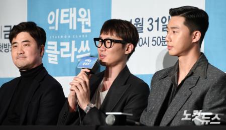 조광진 작가(가운데)가 30일 서울 영등포구 콘래드호텔에서 열린 JTBC 금토드라마 ‘이태원 클라쓰’ 제작발표회에 참석해 작품소개를 하고 있다.