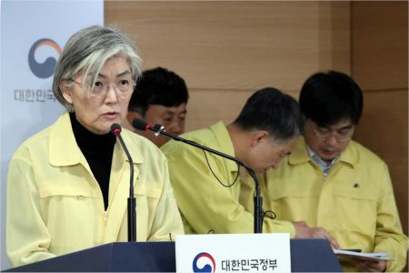 강경화 외교부 장관이 2일 정부서울청사 브리핑실에서 박능후 장관과 관계부처 실·국장 등이 배석한 가운데 확대회의를 마치고 기자들의 질문에 답하고 있다.(사진=연합뉴스)