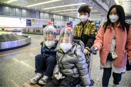 마스크 대용으로 플라스틱병을 쓰고 중국 광저우 공항으로 도착하는 아이들. (사진=연합뉴스)
