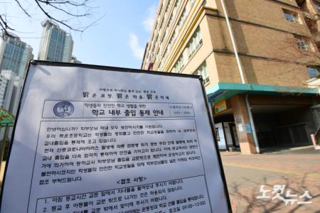 4일 서울 양천구 목운초등학교에 휴업을 알리는 안내판이 놓여 있다. 목운초등학교는 학부모 1명이 부천의 영화관에서 12번째 신종 코로나바이러스 감염증 확진자 옆자리에 앉은 사실이 알려지면서 7일까지 휴업을 결정했다.