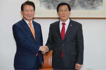 자유한국당 김한표 원내수석부대표(왼쪽)와 더불어민주당 윤후덕 원내수석부대표가 6일 오후 서울 여의도 국회에서 만나 악수하고 있다.(사진=연합뉴스)