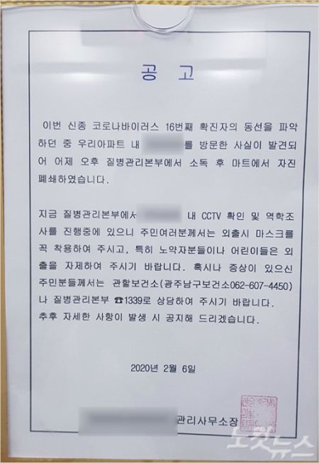 7일 광주 남구보건소 등에 따르면 질병관리본부는 16번 확진자가 최근 광주 남구 지석동의 한 마트에 들른 사실을 확인하고 지난 5일 오후 해당 마트를 소독하고 임시 폐쇄 조치했다.