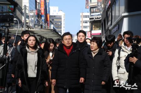 4·15 총선에서 종로 출마를 선언한 자유한국당 황교안 대표가 9일 오후 서울 종로구 관철동 '젊음의 거리'를 찾아 공실 상가를 살펴보고 있다.