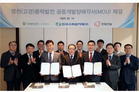 한국수력원자력은 14일 서울 포시즌스호텔에서 한화건설, 지케이윈드와 '풍력발전사업 공동개발을 위한 양해각서(MOU)'를 체결했다.