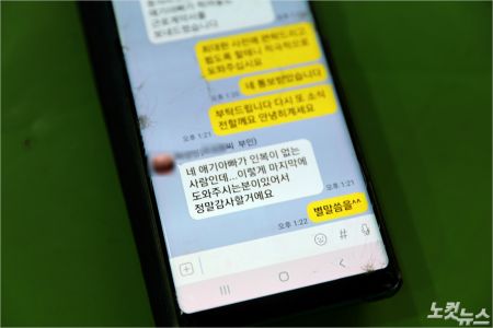 '도와주시는 분이 있어서 정말 감사할거예요' 임금체불로 생을 마감한 조모(45)씨의 전 부인이 동료 박모(50)씨에게 보낸 카카오톡 대화메시지. (사진= 송승민 기자)