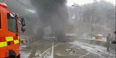 소방당국에 따르면 화물차와 승용차 등 20여 대가 추돌했고, 수산화나트륨으로 추정되는 물질을 적재한 탱크로리에 불이 옮겨붙었다.