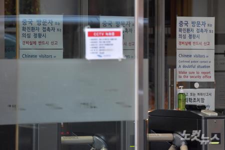 18일 서울 동대문구 서울시립대학교 생활관에 중국 방문자 또는 확진환자 접촉자 또는 의심 정황시 경비실에 반드시 신고하라는 안내 문구가 부착돼 있다.