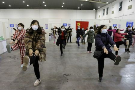 중국 후베이성 우한의 임시병원으로 개조된 대형 컨벤션 센터 내부에서 지난 15일 마스크를 착용한 신종 코로나바이러스 감염증(코로나19) 경증 환자들이 체조를 하고 있다. (사진=연합뉴스)