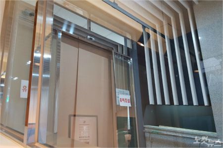24일 오전 사회복지사 확진으로 코호트 격리 조치된 부산 아시아드요양병원 출입문에 블라인드가 내려져 있다. (사진=부산CBS 박진홍 기자)