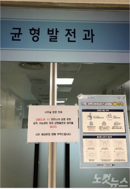 26일 오전 강릉시청 18층 균형발전과 입구에는 "금일(26일) 코로나19 감염 관련 접촉 가능성이 있어 균형발전과 업무를 쉽니다"라는 내용이 게시됐다.