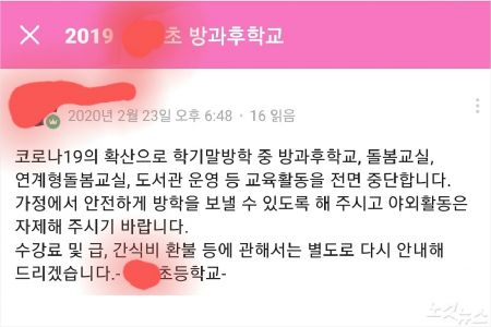 코로나19 감염증 확진자가 급증하던 지난 23일 학교로부터 '방과 후 수업을 전면 중단한다.'는 일방적인 공지를 받았다.
