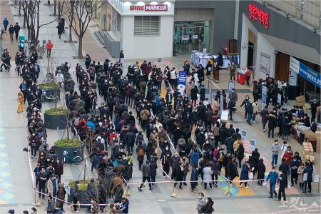 1일 서울 목동동로 행복한백화점 앞 광장에 시민들이 마스크를 구입하기 위해 줄을 서 있다. 박종민기자