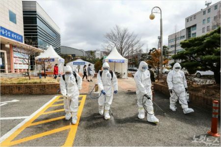 육군 제53사단 장병들이 3월 3일 신종 코로나바이러스 감염증(코로나19) 선별진료소에서 방역을 하고 있다.(사진=육군 제53사단 제공)