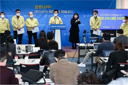 허태정 대전시장이 4일 코로나19 16번째 확진자와 관련해 조치사항 등을 설명하고 있다. (사진=대전시 제공)