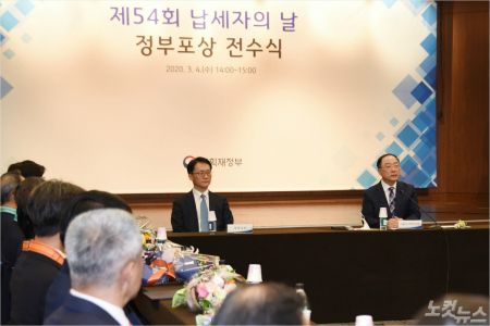 홍남기(오른쪽) 경제부총리 겸 기획재정부 장관이 4일 서울 중구 은행연합회에서 열린 '제54회 납세자의 날 정부포상 전수식'에서 발언하고 있다(사진=기재부 제공)