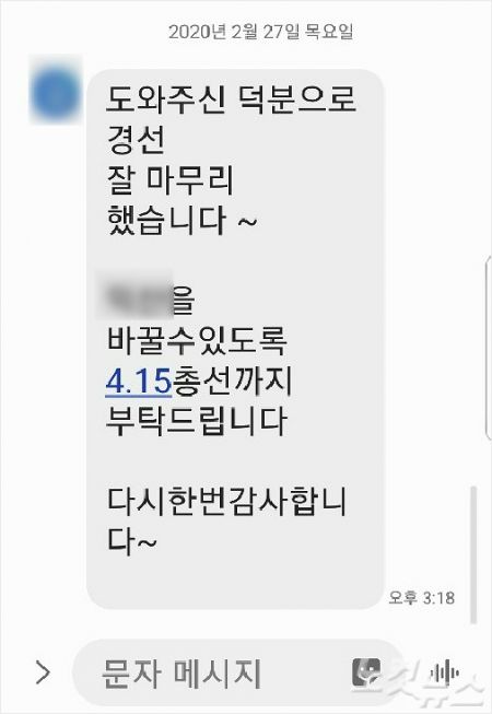 해당 문자 메시지에는 '도와주신 덕분으로 경선 잘 마무리했습니다. ○○을 바꿀 수 있도록 4.15총선까지 부탁드립니다. 다시 한번 감사합니다'고 적혀 있다.