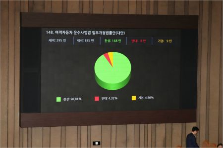 국회 본회의에서 '타다 금지법'으로 불리는 여객자동차 운수사업법 일부개정법률안(대안)이 가결되고 있다.(사진=연합뉴스)