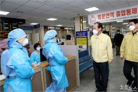 5일 최문순 강원도지사가 원주의료원을 방문해 코로나19 대응 상황을 점검하고 의료진들을 격려하고 있다.(사진=강원도 제공)