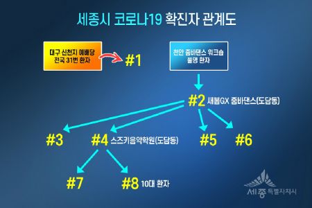 2번 줌바 댄스 강사→4번 줌바 댄스 수강생이자 바이올린 강사→7번·8번 바이올린 교습생 등 세종의 경우 소규모 강습이 주요 감염 통로인 셈이다.