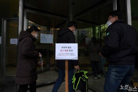 10일 코로나19 무더기 확진자가 발생한 서울 구로구 코리아빌딩 앞에서 임시폐쇄 안내문이 붙어 있다. (사진=이한형 기자)