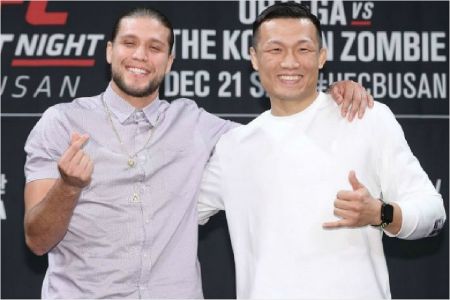 지난 10월 부상 당하기 전 정찬성(오른쪽)과 경기를 앞두고 웃으며 사진을 찍은 오르테가(왼쪽) (사진=UFC 제공)