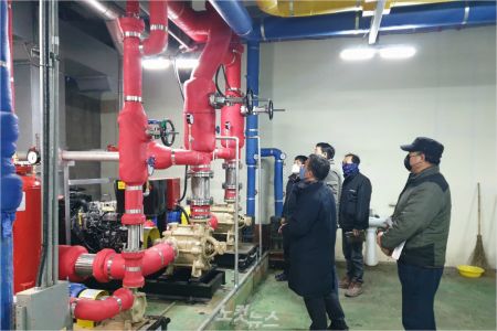 울산시교육청은 예산 47억원을 들여 울산애니원고 등 8개 학교 기숙사에 스프링클러를 설치했다. 스프링클러 시설을 살펴보고 있는 모습.(사진 = 울산교육청 제공)