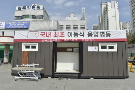 10여 일의 제작 기간이 걸린 음압병동은 음압장치가 설치된 1인실 2개와 화장실 2개를 갖추고 있다.
