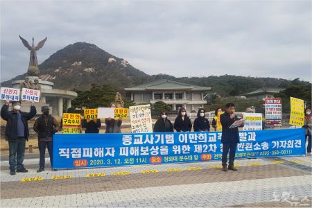 전국신천지피해자연대가 12일, 청와대 분수대광장에서 개최한 '제2차 청춘반환소송 기자회견'.
