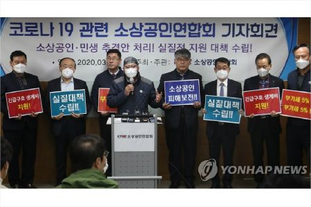 12일 서울 동작구 소상공인연합회에서 열린 코로나19 소상공인 피해 사례 관련 긴급 기자회견에서 참석자들이 코로나19 관련 소상공인 지원대책 마련을 촉구하고 있다. (사진=연합뉴스)
